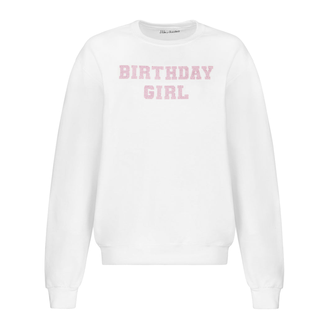 White unisex crewneck sweatshirt with crystal "BIRTHDAY GIRL" in light rose pink embellishment.