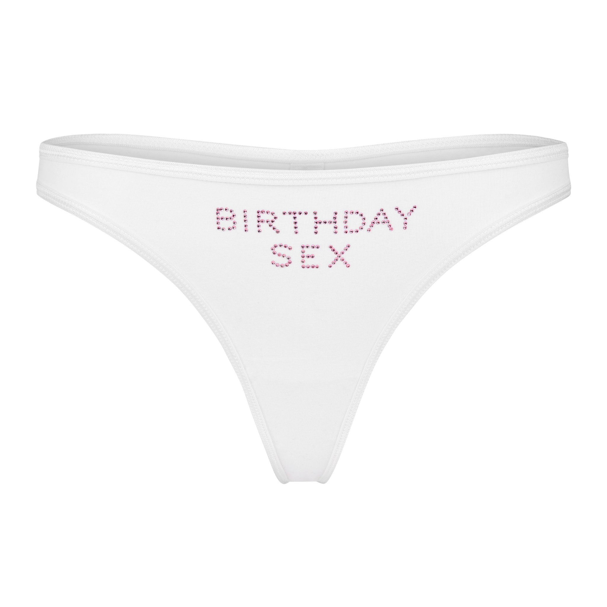 White thong with "BIRTHDAY SEX" in rose pink embellishment.