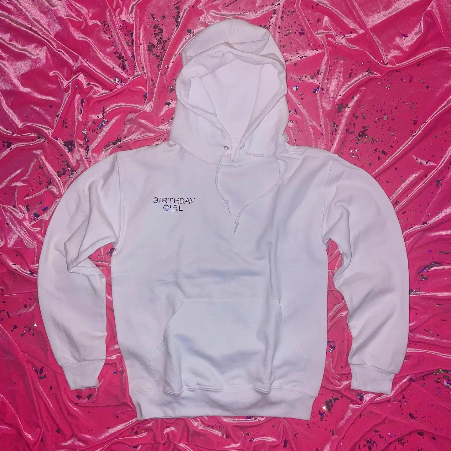 White unisex crewneck sweatshirt with crystal "BIRTHDAY GIRL" in crystal confetti embellishments.
